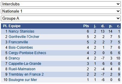 Les résultats de N1 – Groupe A : https://www.echecs.asso.fr/EquipesCalendrier.aspx?Ref=25&Saison=3000
