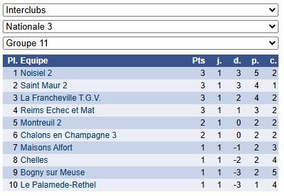 Les résultats de N3 – Groupe 11 : https://www.echecs.asso.fr/EquipesCalendrier.aspx?Ref=47&Saison=3000