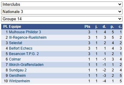 Les résultats de N3 – Groupe 14 : https://www.echecs.asso.fr/EquipesCalendrier.aspx?Ref=50&Saison=3000