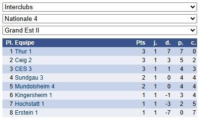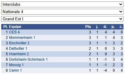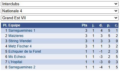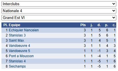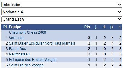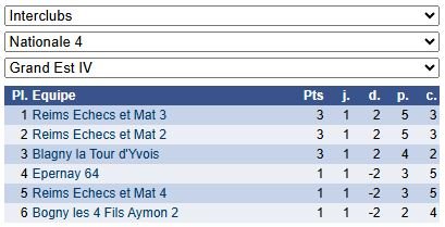 Les résultats de N4 – Groupe 1 : https://www.echecs.asso.fr/EquipesCalendrier.aspx?Ref=89&Saison=3000