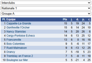 Les résultats de N1 – Groupe A : https://www.echecs.asso.fr/EquipesCalendrier.aspx?Ref=25&Saison=3000