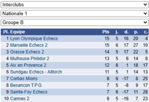 Les résultats de N1 – Groupe B : https://www.echecs.asso.fr/EquipesCalendrier.aspx?Ref=26&Saison=3000