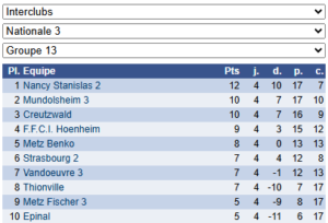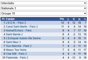Les résultats de N3 – Groupe 10 : https://www.echecs.asso.fr/EquipesCalendrier.aspx?Ref=46&Saison=3000