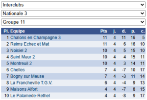 Les résultats de N3 – Groupe 11 : https://www.echecs.asso.fr/EquipesCalendrier.aspx?Ref=47&Saison=3000