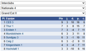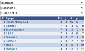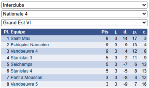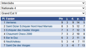 Les résultats de N4 – Groupe 3 : https://www.echecs.asso.fr/EquipesCalendrier.aspx?Ref=91&Saison=3000