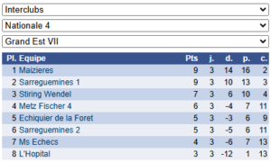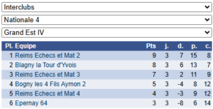 Les résultats de N4 – Groupe 6 : https://www.echecs.asso.fr/EquipesCalendrier.aspx?Ref=142&Saison=3000