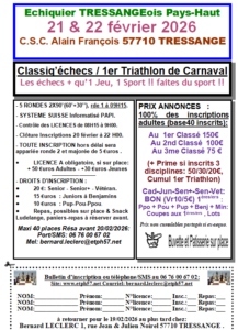 1er Triathlon d’échecs de Carnaval de Tressange Classiq (-2400) – Samedi 21 et dimanche 22 février 2026 : Fédération Française des Échecs