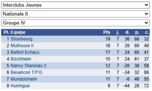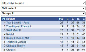 Les résultats de N2 Jeunes – Groupe 3 : https://www.echecs.asso.fr/EquipesCalendrier.aspx?Ref=12&Saison=3000