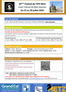 Toutes les infos : https://www.helloasso.com/associations/ecole-francaise-d-echecs-de-metz/evenements/inscription-10eme-festival-de-l-efe-metz